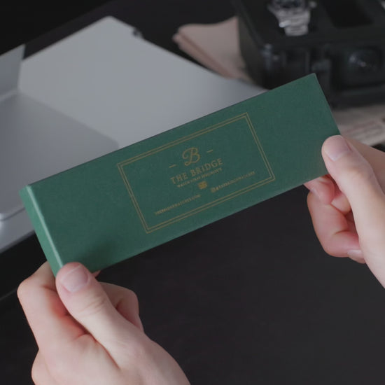 A British Racing Green box, printed with a 12k gold foil and reinforced to withstand up to 20kg of direct pressure. Ensuring your strap gets to you in pristine condition every time.